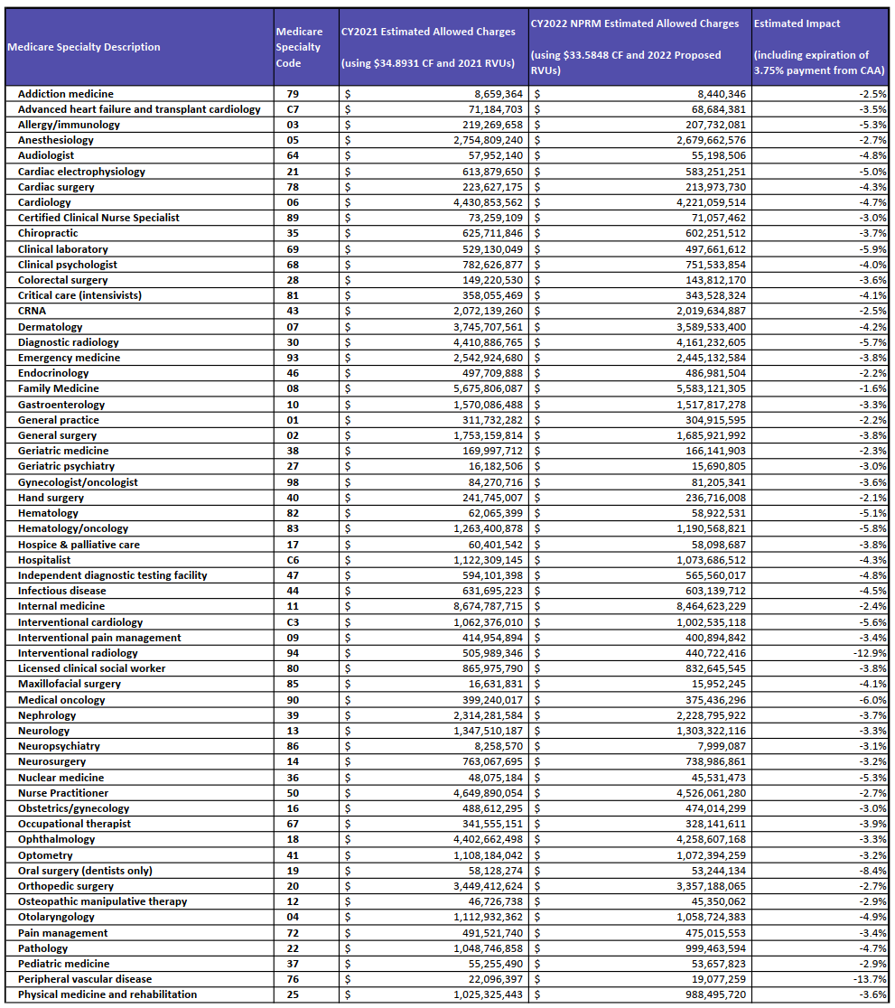 It is estimated that the conversion factor will decrease in amount from the previous year; $1.31 to be exact. Many physician organizations are working together to try and find a solution to these cuts before they are put into effect. Please see the charts below to see how this can affect your specialty.