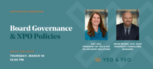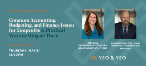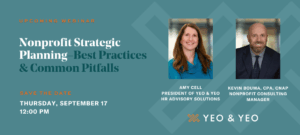 Running a nonprofit is hard work—with long hours, limited staff, and high expectations. Join Yeo & Yeo Nonprofit Consulting Manager Kevin Bouma, CPA, CNAP, and Amy Cell, President of Yeo & Yeo HR Advisory Solutions, for a three-part webinar series designed to help nonprofit leaders, executives, and HR professionals save time, reduce stress, and strengthen boards, finances, and strategy.