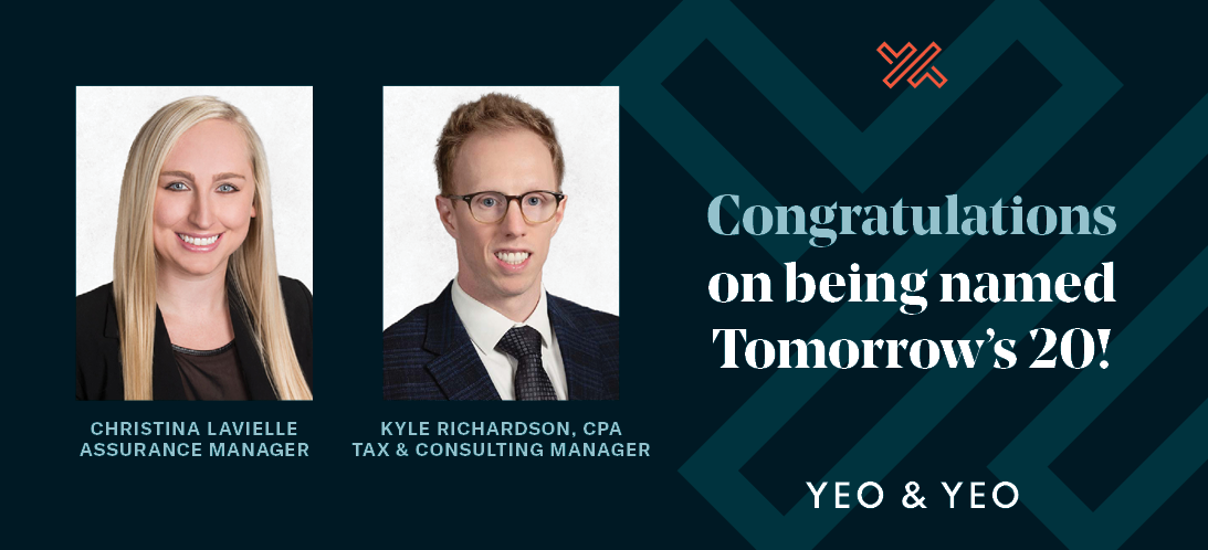 Yeo & Yeo CPAs & Advisors is proud to announce that Christina LaVielle and Kyle Richardson, CPA, have received the Tomorrow’s 20 Award presented by the Auburn Hills Chamber of Commerce. This award recognizes emerging leaders who demonstrate outstanding leadership, innovation, and commitment to community service.