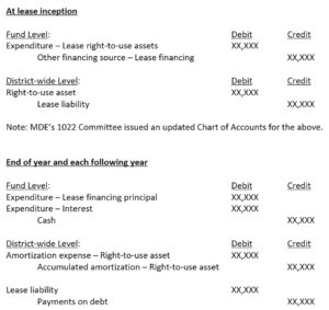 Practical hint: Short-term (less than one year) leases will be recorded as operating leases had been. Leases over one year will be recorded on district-wide financials, and in the year of inception, the lease will be recorded on the fund level statements.